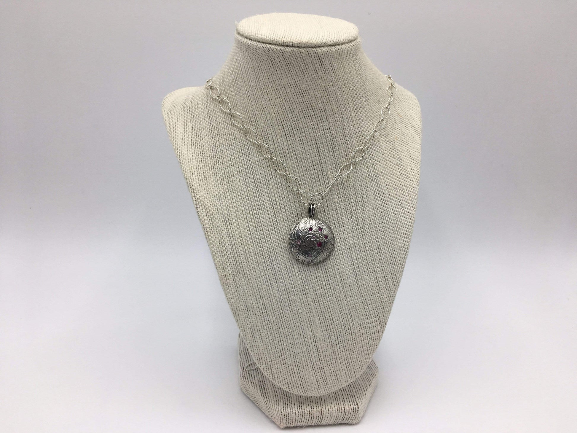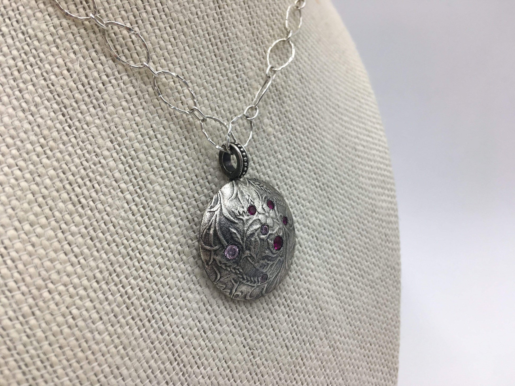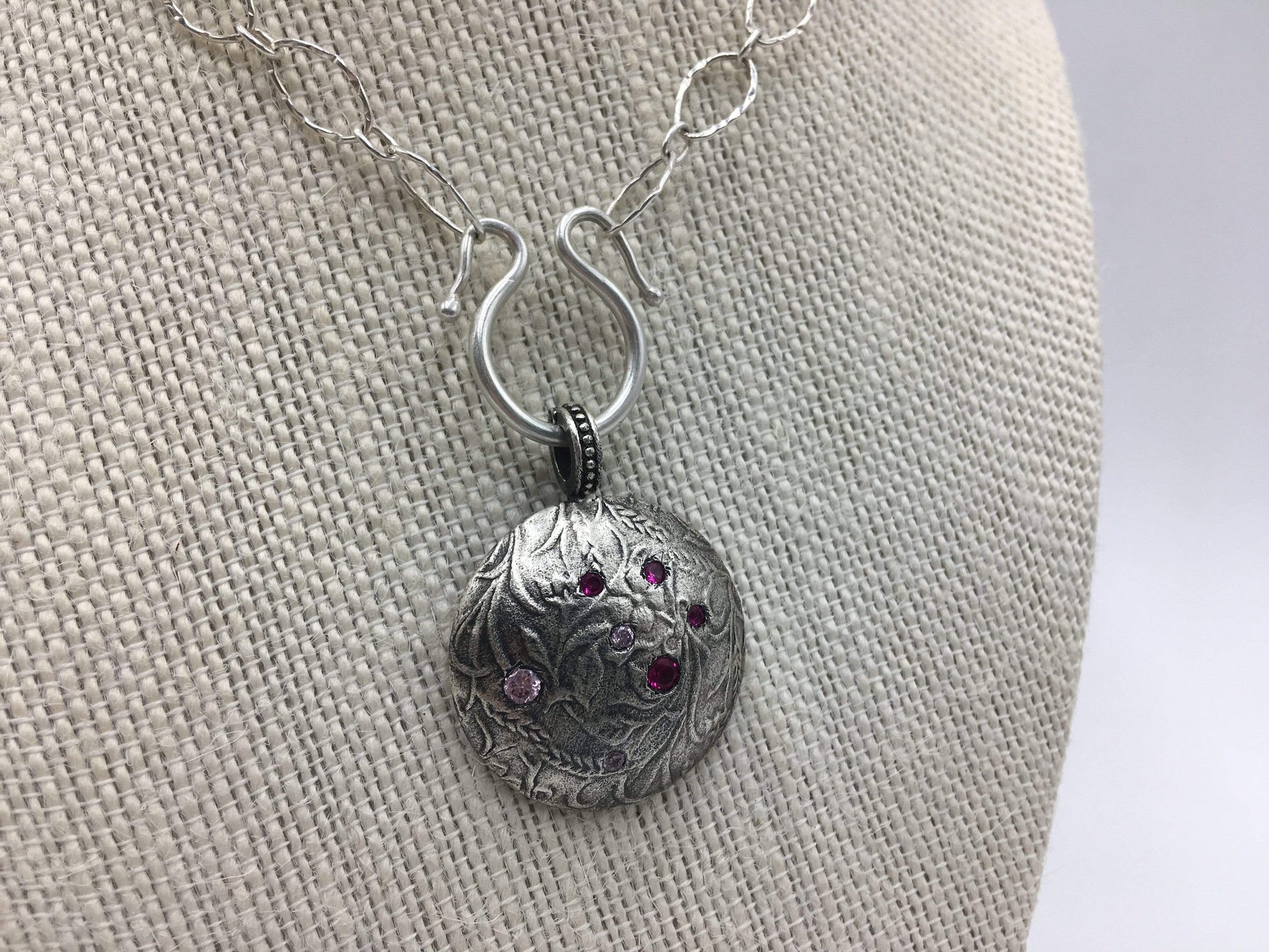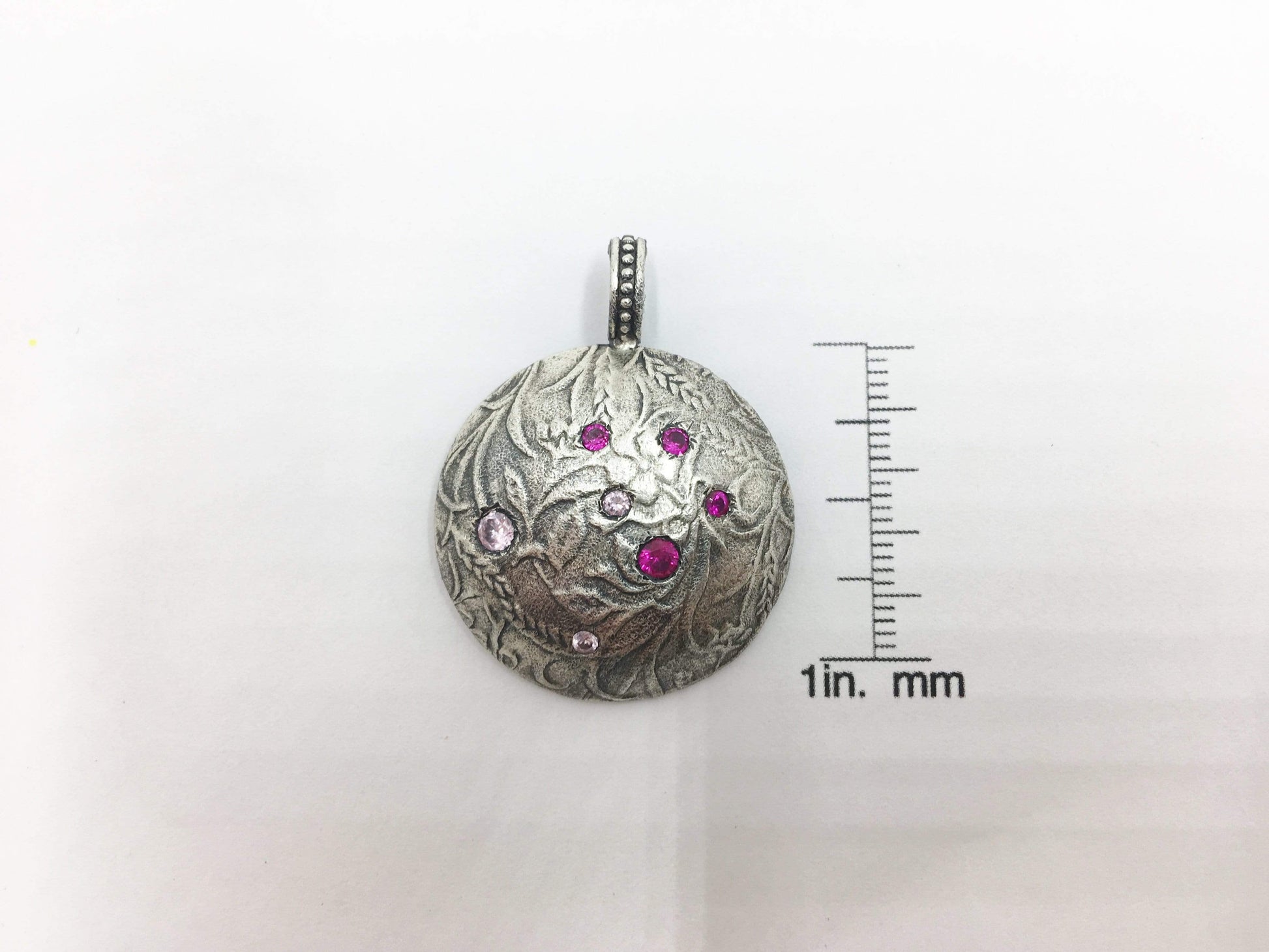 This beautiful sterling silver dome gives you a nature impression with 7 pink rubbies. With the movable clip it can be attached to any of our chains. You could also use our Omega closure to attach the pendant.